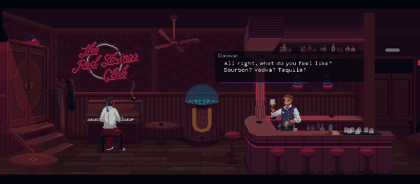 Red Strings Club ottaa askeleen jonnekin oikean pelin ja visuaalisen novellin välimaastoon. Sitä kuvataan ”narratiiviseksi kokemukseksi.” Se näyttää point and click -seikkailulta, muttei varsinaisesti ole sellainen, ainakaan perinteisessä mielessä. Pääosassa on taaskin keskustelut asiakkaiden kanssa, mutta tarina on perinteisempää cyberpunk-juonittelua. Perinteisyys ei tarkoita huonoutta, vaan päin vastoin käsikirjoitus on nytkin A-luokkaa.